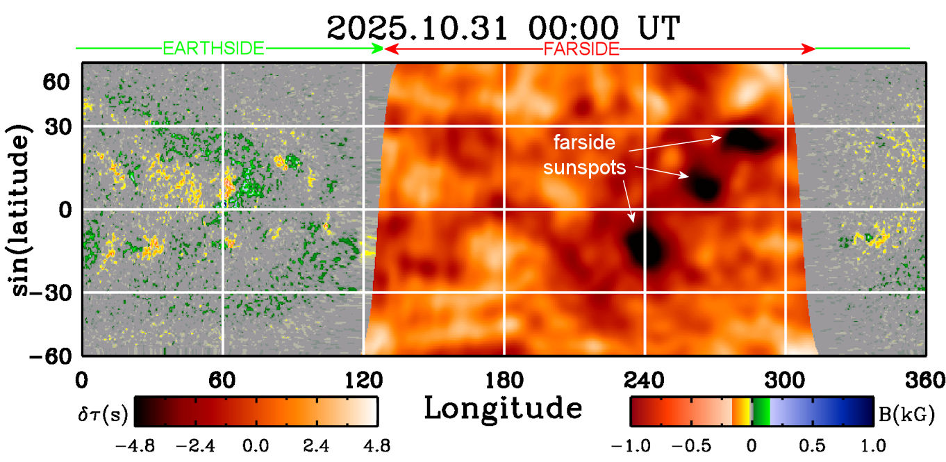 FARSIDE SUNSPOTS ARE COMING: Helioseismic maps of the sun's farside reveal three sunspots only days away from turning toward Earth. One of them has been busy hurling CMEs into space ( #1, #2, #3). If this activity continues apace, Earth will soon be in the line of fire. CME impact alerts: SMS Text.