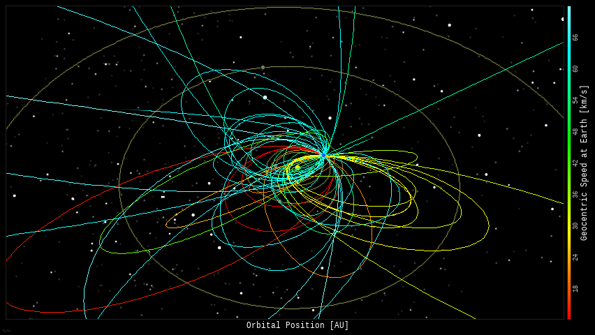 In this diagram of the inner solar system, all of the fireball orbits intersect at a single point--Earth. The orbits are color-coded by velocity, from slow (red) to fast (blue).
