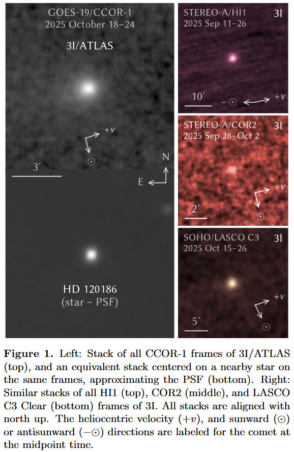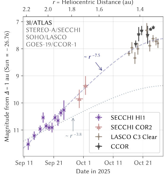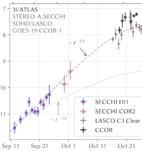 While Earth-based telescopes lost sight of the comet during its close approach to the sun, coronagraphs on spacecraft like STEREO-A, SOHO, and NOAA’s  GOES-19 satellite never stopped watching. The composite image, above, shows how the comet looked to these instruments.  NOAA’s CCOR-1 coronagraph did the best job resolving the comet, showing a 4-arcminute-wide coma (atmosphere), while SOHO's C3 coronagraph collected the best color data, revealing the comet to be bluer than the sun. The blue color hints  that glowing gas, not dust, now dominates its brightness.  Zhang and Battams analyzed coronagraph data from September and October. They found that 3I/ATLAS has been increasing in brightness as the 7.5th power of decreasing distance from the sun--twice as fast as it was brightening earlier this year. This might be caused by a surge in water sublimating from the comet's core, they speculated in the paper.