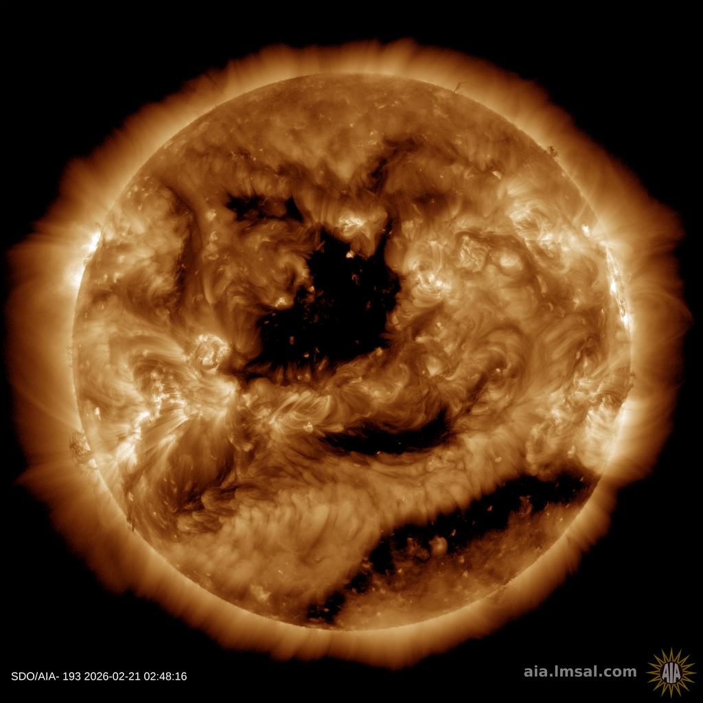 A HOLE IN THE SUN'S ATMOSPHERE: A large hole has opened in the sun's atmosphere, and it is spewing a stream of solar wind toward Earth. Estimated time of arrival: Feb. 24-25. Minor G1-class geomagnetic storms and high-latitude auroras are possible when the gaseous material arrives. Aurora alerts: SMS Text