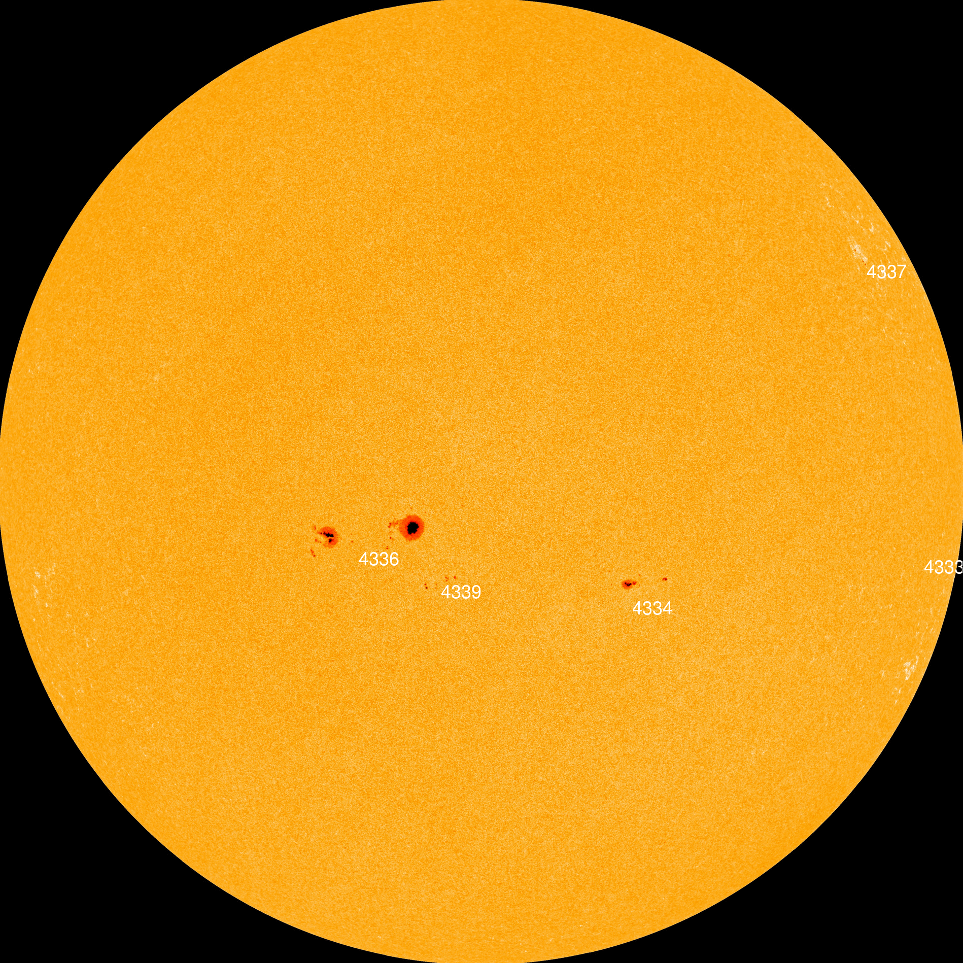 Quiet sunspot 4336 has a delta-class magnetic field that harbors energy for X-class solar flares. So far, however, it refuses to explode. Credit: NASA/SDO