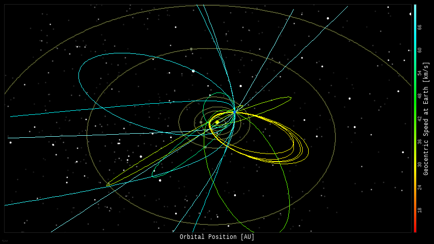 In this diagram of the inner solar system, all of the fireball orbits intersect at a single point--Earth. The orbits are color-coded by velocity, from slow (red) to fast (blue).