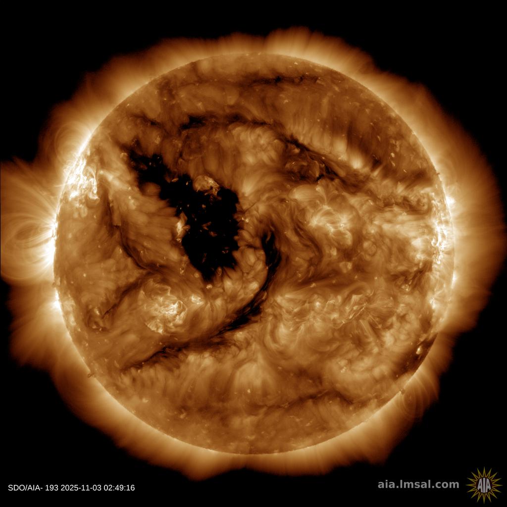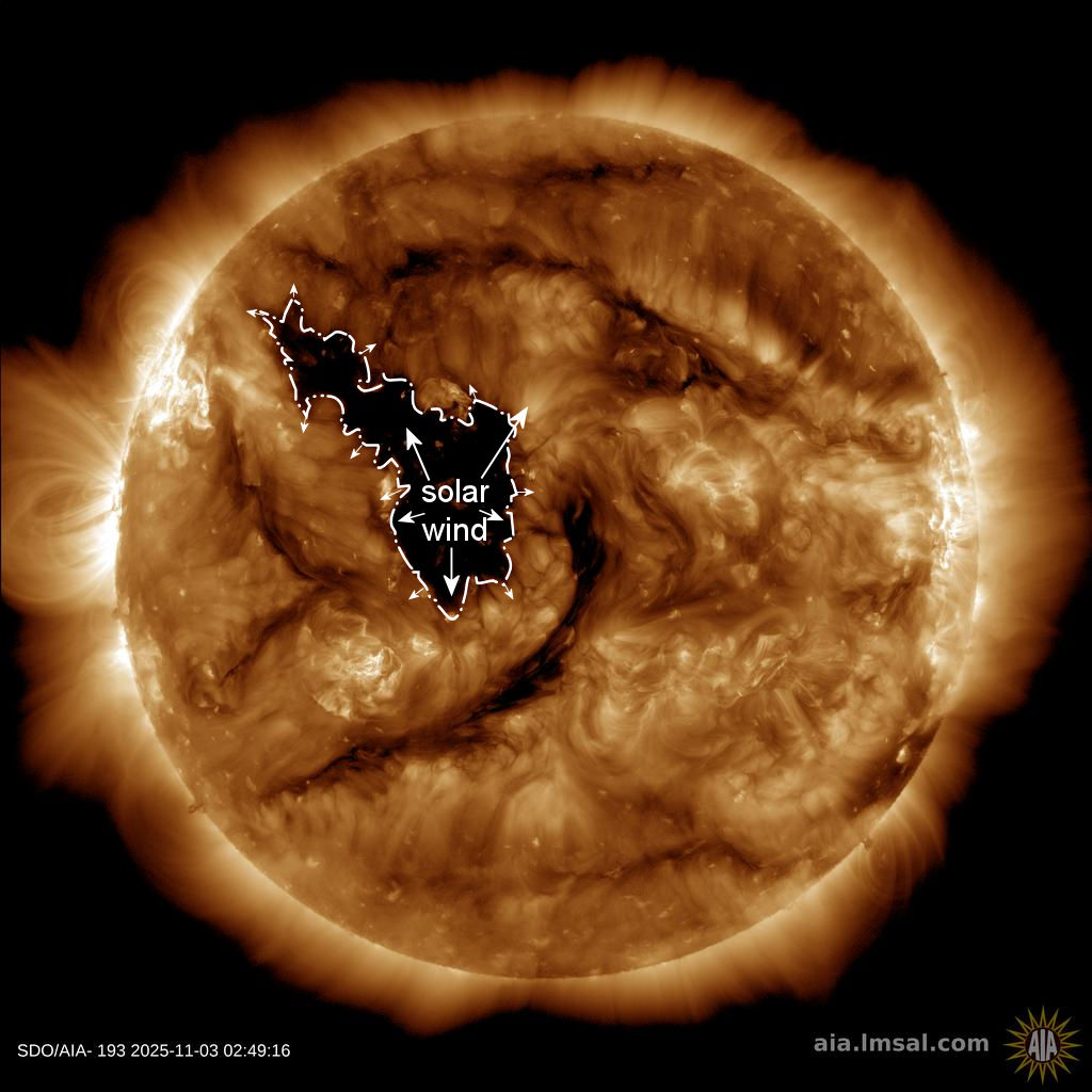A HOLE IN THE SUN'S ATMOSPHERE: An equatorial hole has opened in the sun's atmosphere, and it is spewing a stream of solar wind toward Earth. The gaseous material should arrive on Nov. 6-7, possibly sparking G1-class geomagnetic storms. Aurora alerts: SMS Text.