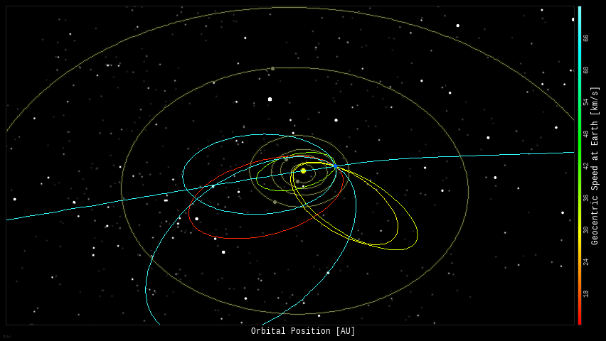 In this diagram of the inner solar system, all of the fireball orbits intersect at a single point--Earth. The orbits are color-coded by velocity, from slow (red) to fast (blue).