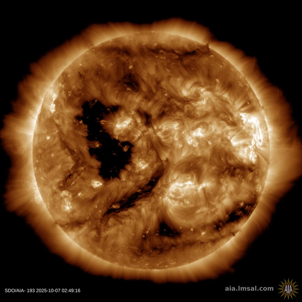 Solar wind flowing from this equatorial coronal hole should reach Earth on Oct. 11-12. Credit: NASA/SDO | more data