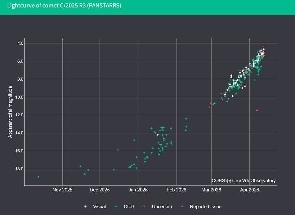 MORNING COMET UPDATE: Over the weekend, Comet PanSTARRS (C/2025 R3) almost doubled in brightness as it continues to approach the sun for a 0.5 AU close encounter on April 19-20. Observers are now reporting magnitudes near +4.5. James Perez-Rogers photographed the brightening comet before sunrise on April 12th from the Ashokan Reservoir in New York: