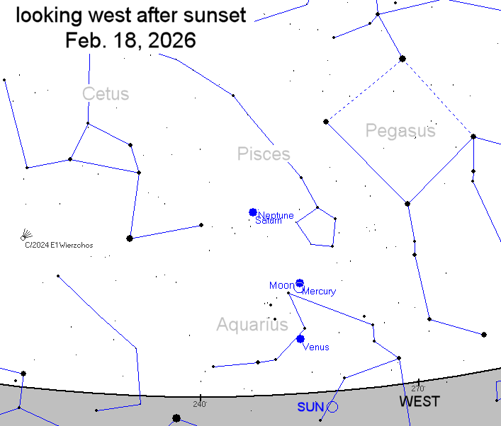 TWILIGHT LUNAR OCCULTATION ALERT: When the sun sets on Wednesday, Feb. 18th, go outside and look west. Mercury and the crescent Moon will be extremely close together low in the twilight sky. Across at least 10 southern US states, the Moon will eclipse or "occult" the planet, producing a photo-op of rare beauty. Enjoy the show! Resources: sky map | Mercury photos | visibility map | city-by-city timetables.