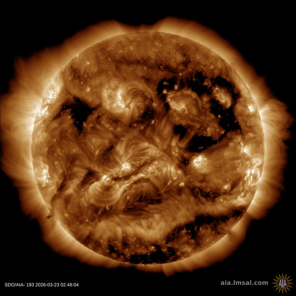 CONTINUED CHANCE OF STORMS: Geomagnetic storms are possible for the third day in a row as solar wind blows faster than 600 km/s from a large hole in the sun's atmosphere. The wind's pressure on Earth's magnetic field could spark G1-class geomagnetic storms on March 23rd. Aurora alerts: SMS Text