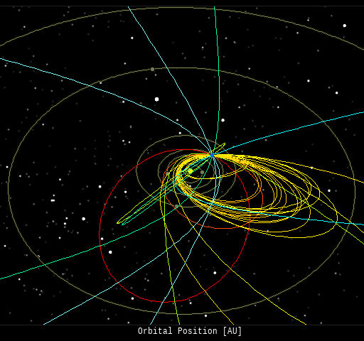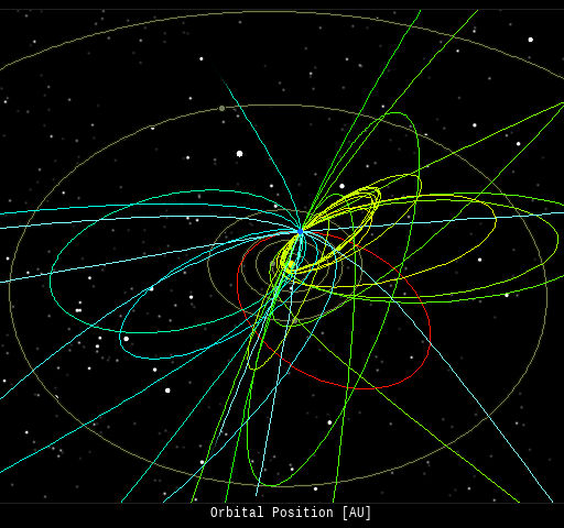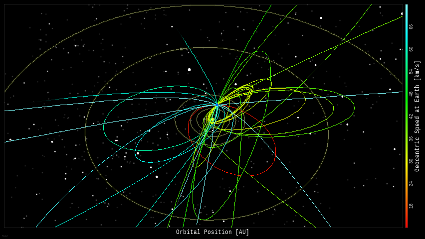 In this diagram of the inner solar system, all of the fireball orbits intersect at a single point--Earth. The orbits are color-coded by velocity, from slow (red) to fast (blue).