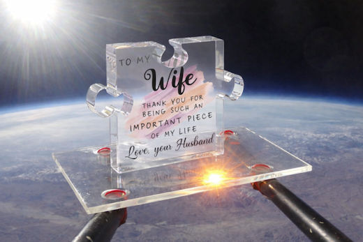 You can have it for $91.95. This acrylic puzzle piece is a love note: "Thank you for being such an important piece of my life," the inscription says. It's a durable reminder that you fit together. The Love Puzzle comes with a unique gift card showing the keepsake at the top of Earth's atmosphere.