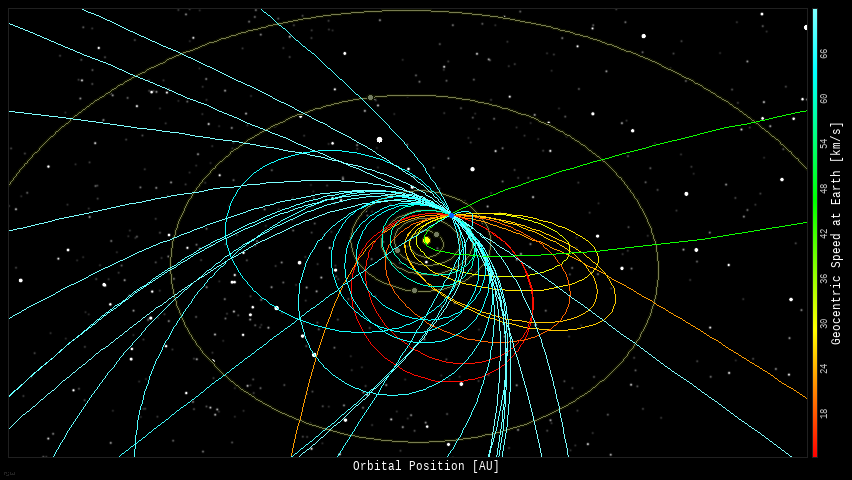 In this diagram of the inner solar system, all of the fireball orbits intersect at a single point--Earth. The orbits are color-coded by velocity, from slow (red) to fast (blue).