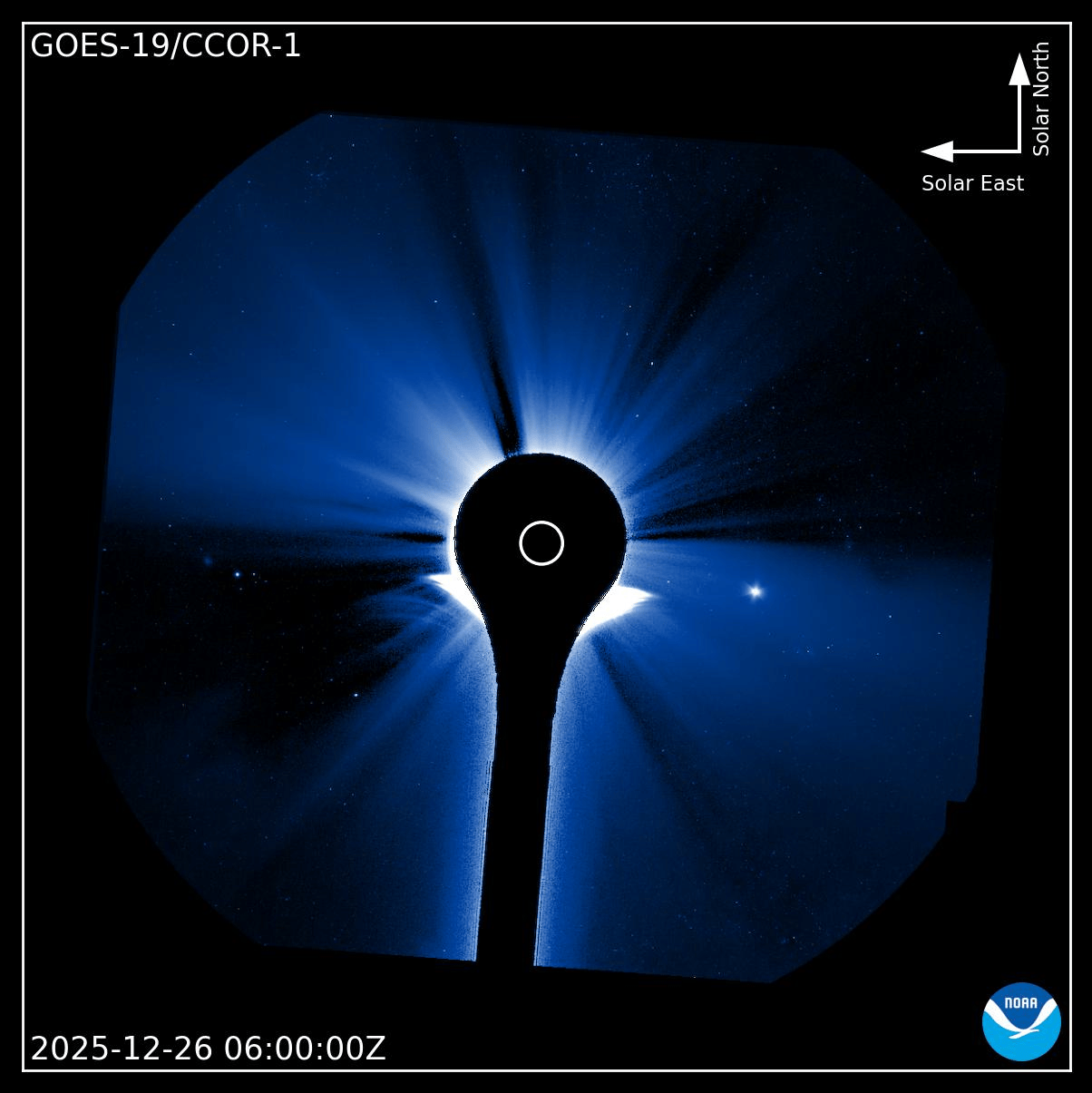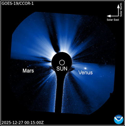 RARE DOUBLE SOLAR CONJUNCTION: Are you looking for Mars or Venus? Don't! You'll hurt your eyes. The two planets are very close to the sun, converging for a rare double solar conjunction. This coronagraph image from NOA's GOES-19 satellite shows the two worlds on Dec. 27th: