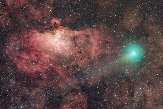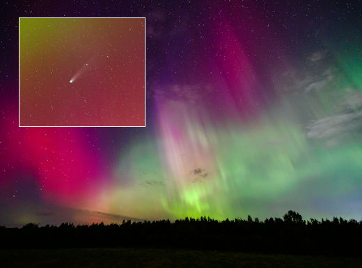 COMET LEMMON AND THE GEOMAGNETIC STORM: An overdue CME passed near Earth during the late hours of Oct. 17th. The near-miss produced an unexpected photo-op. Auroras swallowed Comet Lemmon (C/2025 A6):