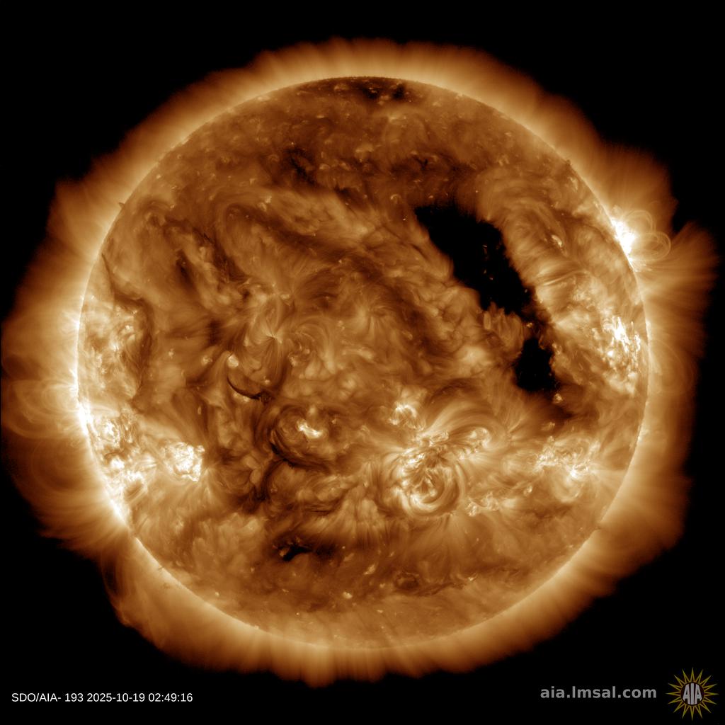 A HOLE IN THE SUN'S ATMOSPHERE: A high-speed stream of solar wind is approaching Earth. The gaseous material is flowing from a large equatorial hole in the sun's atmosphere, and it could spark a G1-class geomagnetic storm when it arrives on Oct. 21st. Aurora alerts: SMS Text.