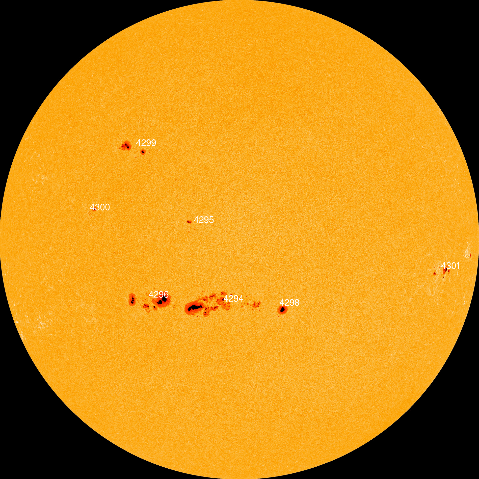 Giant sunspot complex 4294-4296 has a 'beta-gamma-delta' magnetic field that harbors energy for X-class solar flares. Credit: NASA/SDO