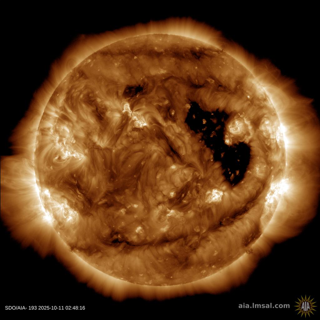 | | Switch to: Europe, USA, New Zealand, Antarctica Credit: NOAA/Ovation Planetary K-index Now: Kp= 2.67 quiet 24-hr max: Kp= 4.67 unsettled explanation | more data Interplanetary Mag. Field Btotal: 12.09 nT Bz: 0.02 nT north more data: ACE, DSCOVR Updated: Today at 1146 UT Coronal Holes: 11 Oct 25  Solar wind flowing from this equatorial coronal hole should reach Earth on Oct. 12-13. Credit: NASA/SDO | more data Polar Stratospheric Clouds Colorful Type II polar stratospheric clouds (PSC) form when the temperature in the stratosphere drops to a staggeringly low -85C. NASA's MERRA-2 climate model predicts when the air up there is cold enough:  On Oct. 6, 2025, the Arctic stratosphere is too hot for polar stratospheric clouds. | more data. SPACE WEATHER NOAA Forecasts | | Updated at: 2025 Oct 11 2200 UTC FLARE | 0-24 hr | 24-48 hr | CLASS M | 20 % | 20 % | CLASS X | 01 % | 01 % | Geomagnetic Storms: Probabilities for significant disturbances in Earth's magnetic field are given for three activity levels: active, minor storm, severe storm Updated at: 2025 Oct 11 2200 UTC Mid-latitudes | 0-24 hr | 24-48 hr | ACTIVE | 40 % | 45 % | MINOR | 25 % | 25 % | SEVERE | 05 % | 05 % | High latitudes | 0-24 hr | 24-48 hr | ACTIVE | 10 % | 10 % | MINOR | 25 % | 25 % | SEVERE | 65 % | 60 % | | | |  | | | | | | | | This is an AI Free Zone: Text created by Large Language Models is spreading across the Internet. It's well-written, but frequently inaccurate. If you find a mistake on Spaceweather.com, rest assured it was made by a real human being. | | | GEOMAGNETIC STORM WATCH (G1): Minor G1-class geomagnetic torms are likely on Oct. 12-13 as Earth enters a high-speed stream of solar wind. The gaseous material is flowing from an equatorial hole in the sun's atmosphere. Aurora alerts: SMS Text. EARTH'S RING CURRENT IS LEAKING: This morning in New Zealand, Fabrizio Melandri observed a red arc in the sky near the Nugget Point Lighthouse. It's a sign that Earth's ring system is leaking:  Yes, Earth has rings. They're made of electricity. The ring current system is a donut-shaped circuit carrying millions of amps around our planet. It is created by opposing motions of electrons and ions in Earth's rotating magnetic field. Somethimes, thermal energy from the ring current leaks into the atmosphere below. This creates a red arc in the sky like the one Fabrizio Melandri observed. These red arcs were discovered in 1956 at the beginning of the Space Age. At first, researchers didn’t know what they were and unwittingly gave them a misleading name: "Stable Auroral Red arcs" or SAR arcs, for short. However, they are not auroras. Realtime Space Weather Photo Gallery Free: Spaceweather.com Newsletter MARTIAN SPACE SEED EXPERIMENT: This is a student science project--and you can participate. On Oct. 4, 2025, young scientists launched six test tubes of seeds into the stratosphere, where they floated as high as 100,676 feet for almost three hours:  The okra, tomato, and jalapeño pepper seeds were exposed to temperatures as low as -63 C and cosmic ray fluxes 100x Earth-normal. In the Spring, the students will plant these seeds alongside control samples to discover the difference space travel makes. You can do the same experiment! For $99, you can have a test tube of flown seeds and a packet of control seeds that remained on Earth. We'll be eager to hear what happens in your own space garden. Far Out Gifts: Earth to Sky Store All sales support hands-on STEM education Realtime Space Weather Photo Gallery Free: Spaceweather.com Newsletter Realtime Aurora Photo Gallery Free: Spaceweather.com Newsletter Every night, a network of NASA all-sky cameras scans the skies above the United States for meteoritic fireballs. Automated software maintained by NASA's Meteoroid Environment Office calculates their orbits, velocity, penetration depth in Earth's atmosphere and many other characteristics. Daily results are presented here on Spaceweather.com. On Oct 11, 2025, the network reported 3 fireballs. (3 sporadics) In this diagram of the inner solar system, all of the fireball orbits intersect at a single point--Earth. The orbits are color-coded by velocity, from slow (red) to fast (blue). [Larger image] [movies] Potentially Hazardous Asteroids ( PHAs) are space rocks larger than approximately 100m that can come closer to Earth than 0.05 AU. None of the known PHAs is on a collision course with our planet, although astronomers are finding new ones all the time. On October 11, 2025 there were 2349 potentially hazardous asteroids.  | Recent & Upcoming Earth-asteroid encounters: Asteroid | Date(UT) | Miss Distance | Velocity (km/s) | Diameter (m) | 2025 TC1 | 2025-Oct-06 | 11.1 LD | 5.7 | 15 | 2025 SC24 | 2025-Oct-06 | 11.8 LD | 13.3 | 30 | 2025 SH25 | 2025-Oct-06 | 9.3 LD | 12.8 | 15 | 2025 SM15 | 2025-Oct-07 | 8 LD | 10.3 | 12 | 2025 SJ29 | 2025-Oct-08 | 8.4 LD | 10.5 | 18 | 2022 TU1 | 2025-Oct-08 | 16.9 LD | 12.9 | 10 | 2020 QU5 | 2025-Oct-08 | 11.7 LD | 13.2 | 26 | 2025 TF1 | 2025-Oct-08 | 8.4 LD | 17.5 | 21 | 2025 TN2 | 2025-Oct-08 | 3.5 LD | 14 | 28 | 2025 SP23 | 2025-Oct-09 | 1.3 LD | 14.8 | 29 | 2025 SA21 | 2025-Oct-09 | 9.3 LD | 7.8 | 18 | 2025 SP15 | 2025-Oct-09 | 16.4 LD | 8 | 36 | 2025 SP29 | 2025-Oct-10 | 9.7 LD | 14.2 | 22 | 2025 SN29 | 2025-Oct-10 | 12.5 LD | 9 | 21 | 2025 TS2 | 2025-Oct-11 | 17.3 LD | 8.3 | 26 | 2025 TU1 | 2025-Oct-13 | 6 LD | 7.5 | 17 | 2025 TV2 | 2025-Oct-13 | 3.3 LD | 7.5 | 14 | 2025 SC29 | 2025-Oct-14 | 14.9 LD | 6.7 | 18 | 2022 AY5 | 2025-Oct-14 | 7.4 LD | 8.4 | 5 | 2022 UY3 | 2025-Oct-15 | 10.2 LD | 7.4 | 15 | 2025 SX26 | 2025-Oct-16 | 8.6 LD | 8.4 | 21 | 2025 SQ27 | 2025-Oct-16 | 15.2 LD | 7.5 | 17 | 2025 TR2 | 2025-Oct-17 | 12.7 LD | 16.3 | 55 | 2022 UU15 | 2025-Oct-19 | 14.8 LD | 16.1 | 34 | 2025 SD7 | 2025-Oct-21 | 9.9 LD | 12.5 | 53 | 2023 UK3 | 2025-Oct-21 | 6.7 LD | 9 | 5 | 2025 TU4 | 2025-Oct-21 | 15.4 LD | 7.7 | 17 | 2024 GD2 | 2025-Oct-22 | 17.8 LD | 4.2 | 28 | 2022 HM1 | 2025-Oct-23 | 15.1 LD | 13.