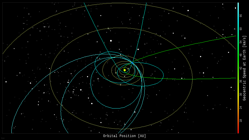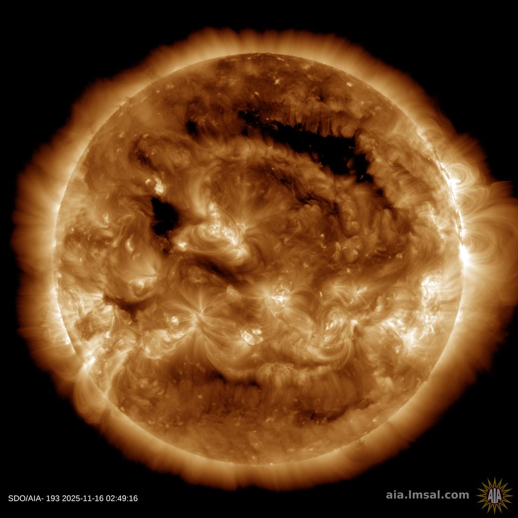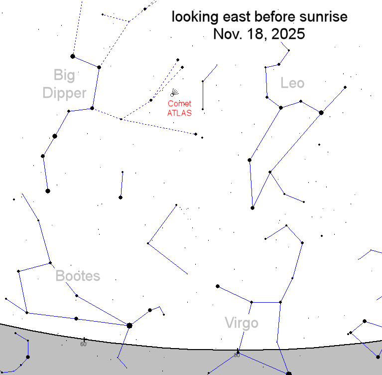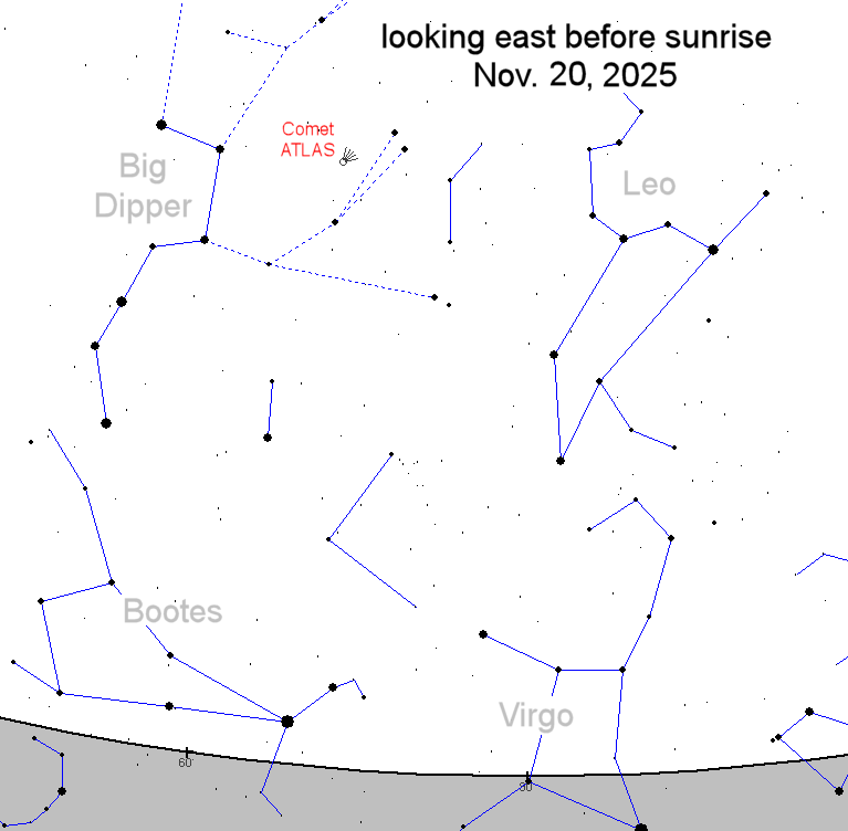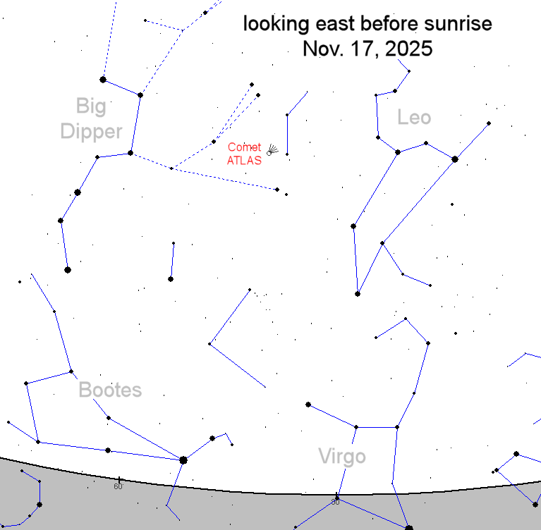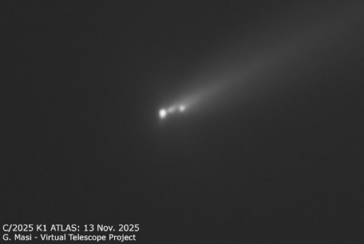 | | | SPACE WEATHER NOAA Forecasts | | Updated at: 2025 Nov 16 2200 UTC FLARE | 0-24 hr | 24-48 hr | CLASS M | 55 % | 20 % | CLASS X | 15 % | 01 % | Geomagnetic Storms: Probabilities for significant disturbances in Earth's magnetic field are given for three activity levels: active, minor storm, severe storm Updated at: 2025 Nov 16 2200 UTC Mid-latitudes | 0-24 hr | 24-48 hr | ACTIVE | 40 % | 30 % | MINOR | 30 % | 15 % | SEVERE | 05 % | 01 % | High latitudes | 0-24 hr | 24-48 hr | ACTIVE | 10 % | 15 % | MINOR | 25 % | 30 % | SEVERE | 65 % | 45 % | | | |  | | | | | | | | | | | This is an AI Free Zone: Text created by Large Language Models is spreading across the Internet. It's well-written, but frequently inaccurate. If you find a mistake on Spaceweather.com, rest assured it was made by a real human being. | | | THE CME MISSED: A CME hurled into space by Friday's X4-class solar flarepassed Earth on Nov. 16th (~0100 UT). The near miss did not spark a geomagnetic storm. This brings an end to the stormy space weather caused by sunspot 4274, which will spend the next two weeks transiting the farside of the sun. Earth is no longer in the strike zone. Solar flare alerts: SMS Text. THE GOLDEN COMET IS FALLING APART: Last week, California astronomer Dan Bartlett pointed his telescope at golden comet C/2025 K1 (ATLAS) to capture a close encounter with the Leo Triplet of galaxies. He quickly realized something was wrong.  "Upon close inspection, the coma appeared to be somewhat flattened, and the nucleus appeared somewhat elongated," he noticed. These were early signs that the comet was breaking apart. On Nov. 12th, Gianluca Masi of the Virtual Telescope Project in Italy saw the comet's nucleus splitting into three pieces:  "I managed to capture several fragments of this comet," says Masi. "This animation shows Nov. 12th vs. 13th, making clear how things evolved." Even before it started crumbling, astronomers knew the comet was unusual. It had an almost-unheard-of golden color probably linked to its strange chemistry. All of the carbon compounds, which give comets their usual green and blue colors, are severely depleted in C/2025 K1 (ATLAS). No one knows why. Now, the golden comet is a triple comet. You can see the fragments drifting apart using a mid-sized backyard telescope. The 10th magnitude comet is located in the morning sky not far below the bowl of the Big Dipper. Sky maps: Nov. 17, 18, 19 , 20. Realtime Aurora Photo Gallery Free: Spaceweather.com Newsletter ARCTIC NIGHT SPACE PENDENT: Are you looking for a far-out Christmas gift? Consider the Arctic Night Pendant . It has flown to the edge of space onboard an Earth to Sky cosmic ray research balloon, more than 105,546 ft high:  You can have it for $99.95. The heart-shaped pendant displays a loving pair of howling Arctic wolves, a shooting star, the full Moon, and rippling sheets of aurora borealis. It comes with a greeting card showing the pendent in flight and telling the story of its trip to the edge of space and back again. Far Out Gifts: Earth to Sky Store All sales support hands-on STEM education Realtime Space Weather Photo Gallery Free: Spaceweather.com Newsletter Every night, a network of NASA all-sky cameras scans the skies above the United States for meteoritic fireballs. Automated software maintained by NASA's Meteoroid Environment Office calculates their orbits, velocity, penetration depth in Earth's atmosphere and many other characteristics. Daily results are presented here on Spaceweather.com. On Nov 16, 2025, the network reported 7 fireballs. (3 sporadics, 3 Leonids, 1 November omega Orionid) In this diagram of the inner solar system, all of the fireball orbits intersect at a single point--Earth. The orbits are color-coded by velocity, from slow (red) to fast (blue). [Larger image] [movies] Potentially Hazardous Asteroids ( PHAs) are space rocks larger than approximately 100m that can come closer to Earth than 0.05 AU. None of the known PHAs is on a collision course with our planet, although astronomers are finding new ones all the time. On November 16, 2025 there were 2349 potentially hazardous asteroids.  | Recent & Upcoming Earth-asteroid encounters: | Asteroid | Date(UT) | Miss Distance | Velocity (km/s) | Diameter (m) | | 2025 VU3 | 2025-Nov-11 | 5.3 LD | 8 | 12 | | 2025 VX | 2025-Nov-11 | 1.2 LD | 6.4 | 14 | | 2025 VV4 | 2025-Nov-11 | 0.3 LD | 20.3 | 4 | | 2012 VC26 | 2025-Nov-11 | 13.3 LD | 6.4 | 6 | | 2025 VA3 | 2025-Nov-11 | 11.2 LD | 20.5 | 20 | | 2025 VM3 | 2025-Nov-11 | 2.2 LD | 16.7 | 13 | | 2025 UP9 | 2025-Nov-11 | 18 LD | 14 | 46 | | 2025 VB3 | 2025-Nov-12 | 13.5 LD | 3.6 | 10 | | 2025 VL3 | 2025-Nov-12 | 0.3 LD | 15.5 | 5 | | 2025 VX3 | 2025-Nov-12 | 5.5 LD | 14.2 | 14 | | 2025 VJ3 | 2025-Nov-12 | 4.7 LD | 12.9 | 41 | | 2025 VK5 | 2025-Nov-12 | 3.1 LD | 12.6 | 8 | | 2025 VW | 2025-Nov-12 | 5.4 LD | 7.1 | 16 | | 2025 VR4 | 2025-Nov-12 | 0.5 LD | 10.3 | 3 | | 2025 VN2 | 2025-Nov-12 | 13.4 LD | 5.2 | 16 | | 2025 VC2 | 2025-Nov-12 | 8.1 LD | 9.2 | 14 | | 2025 VZ3 | 2025-Nov-12 | 13.2 LD | 9.4 | 25 | | 2025 VS3 | 2025-Nov-13 | 0.5 LD | 11.4 | 11 | | 2025 VT2 | 2025-Nov-13 | 0.6 LD | 14.1 | 7 | | 2025 VV1 | 2025-Nov-13 | 6.2 LD | 11.3 | 30 | | 2025 VV3 | 2025-Nov-13 | 0.2 LD | 20.7 | 7 | | 2025 VR1 | 2025-Nov-13 | 3.1 LD | 8.1 | 11 | | 2025 VS2 | 2025-Nov-14 | 0.9 LD | 6.6 | 4 | | 2025 US11 | 2025-Nov-14 | 12.7 LD | 8.1 | 22 | | 2025 VA2 | 2025-Nov-14 | 5.1 LD | 5.8 | 8 | | 2019 VL5 | 2025-Nov-14 | 14.7 LD | 9.1 | 24 | | 2025 VD1 | 2025-Nov-14 | 3.4 LD | 6.6 | 14 | | 2025 VD5 | 2025-Nov-14 | 13.1 LD | 11.9 | 54 | | 2025 VS1 | 2025-Nov-14 | 4 LD | 9.8 | 16 | | 2025 VJ5 | 2025-Nov-14 | 14.9 LD | 9.2 | 18 | | 2025 VT4 | 2025-Nov-15 | 7.1 LD | 7.2 | 9 | | 2025 VB5 | 2025-Nov-15 | 16.6 LD | 8.7 | 17 | | 2025 VT3 | 2025-Nov-15 | 3 LD | 7.6 | 14 | | 2025 VQ2 | 2025-Nov-15 | 3.3 LD | 5.8 | 11 | | 2025 VN1 | 2025-Nov-16 | 4.6 LD | 10.7 | 19 | | 2025 VW3 | 2025-Nov-16 | 1.5 LD | 14 | 10 | | 2025 VG5 | 2025-Nov-17 | 15.4 LD | 