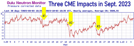 THREE CME IMPACTS IN SEPTEMBER: The sun has been buffeting Earth with CMEs. In September there were three significant strikes, each one sparking a geomagnetic storm with mid-latitude auroras. Another side-effect might surprise you. Each CME reduced cosmic radiation around our planet: