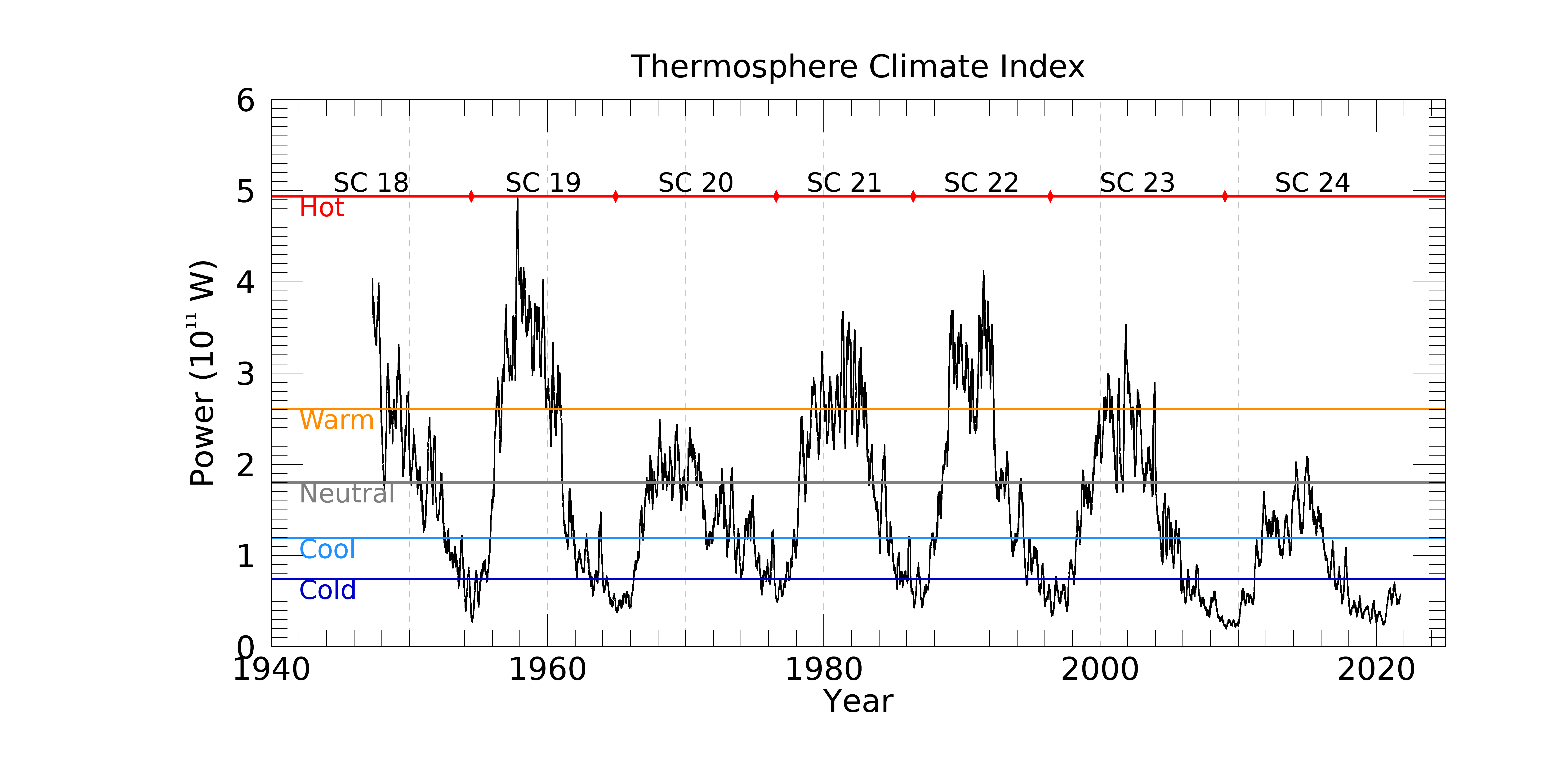 Thermosphere Climate Index today: 5.67x1010W Cold Max: 49.4x1010 W Hot (10/1957) Min: 2.05x1010 W Cold (02/2009) explanation | more data:gfx, txt Updated 03 Oct 2021