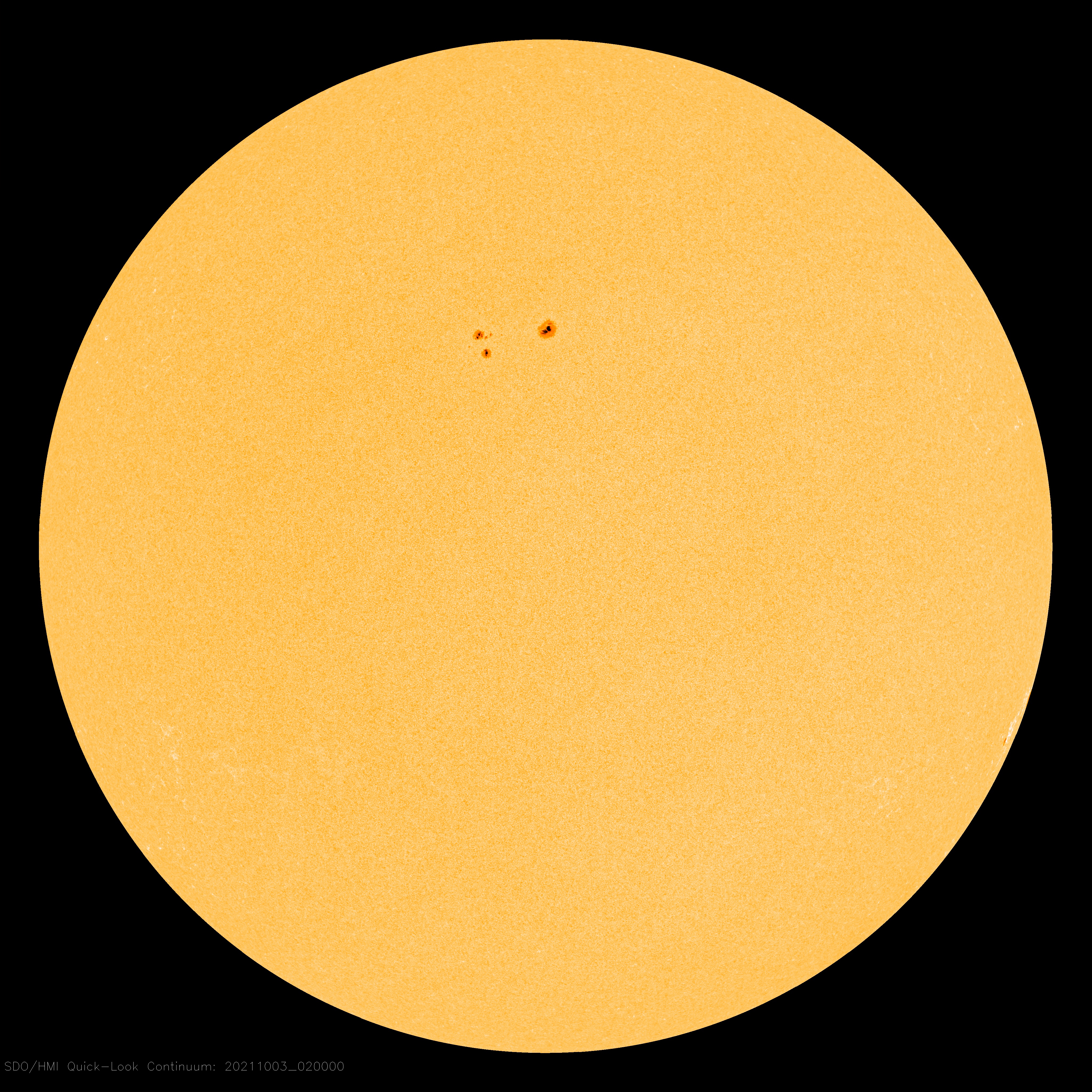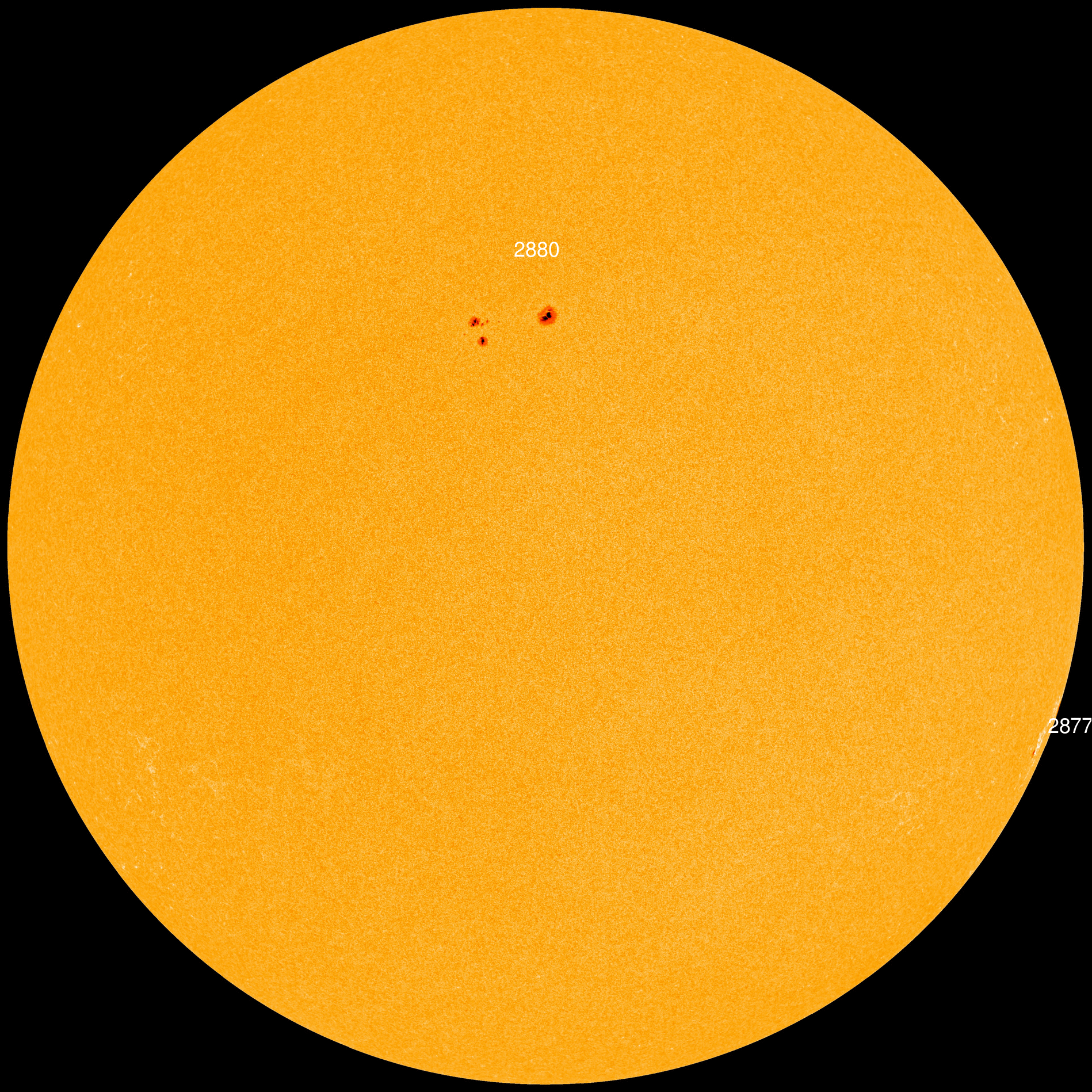 Emerging sunspot AR2882 has an unknown potential for flares. We cannot yet see the structure of its magnetic field because it is still so close to the northeastern limb. Credit: SDO/HMI