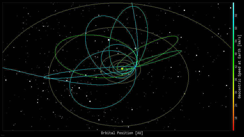 In this diagram of the inner solar system, all of the fireball orbits intersect at a single point--Earth. The orbits are color-coded by velocity, from slow (red) to fast (blue). [Larger image] [movies]