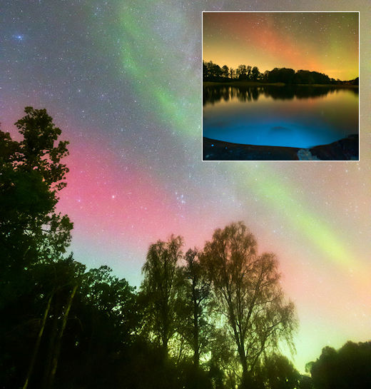 "My son and I were surprised by this red bow in the south," reports P-M Hedén, who photographed the display from Norrtälje, Sweden. It was so bright, he even captured its reflection in a local pond: