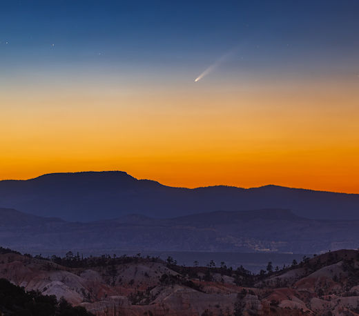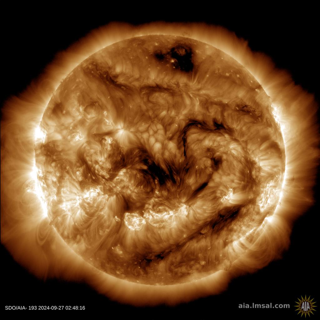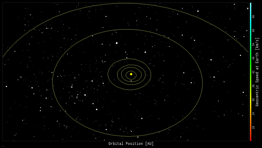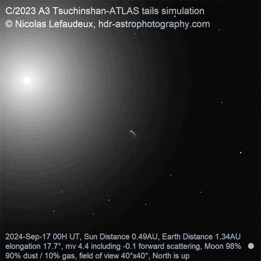 | | | Switch to: Europe, USA, New Zealand, Antarctica Credit: NOAA/Ovation Planetary K-index Now: Kp= 0.67 quiet 24-hr max: Kp= 2.67 quiet explanation | more data Interplanetary Mag. Field Btotal: 5.01 nT Bz: 3.87 nT north more data: ACE, DSCOVR Updated: Today at 1147 UT Coronal Holes: 27 Sep 24  There are no significant equatorial coronal holes on the Earth-facing side of the sun. Credit: SDO/AIA Polar Stratospheric Clouds Colorful Type II polar stratospheric clouds (PSC) form when the temperature in the stratosphere drops to a staggeringly low -85C. NASA's MERRA-2 climate model predicts when the air up there is cold enough:  On Sep. 27, 2024, the Arctic stratosphere is much too warm for Type II polar stratospheric clouds. | more data. Noctilucent Clouds The northern season for NLCs is underway--but not for long. The first clouds were detected inside the Arctic Circle on May 25, 2024, by the NOAA 21 satellite. After peaking in July, the clouds are now in rapid decline. This is typical for the month of August, which usually brings the end of NLC season in the northern hemisphere.  Updated: Aug. 28, 2024 An instrument onboard NOAA 21 (OMPS LP) is able to detect NLCs (also known as "polar mesospheric clouds" or PMCs). In the daily map, above, each dot is a detected cloud. As the season progresses, these dots will multiply in number and shift in hue from blue to red as the brightness of the clouds intensifies. SPACE WEATHER NOAA Forecasts | | Updated at: 2024 Sep 27 2200 UTC FLARE | 0-24 hr | 24-48 hr | CLASS M | 55 % | 55 % | CLASS X | 15 % | 15 % | Geomagnetic Storms: Probabilities for significant disturbances in Earth's magnetic field are given for three activity levels: active, minor storm, severe storm Updated at: 2024 Sep 27 2200 UTC Mid-latitudes | 0-24 hr | 24-48 hr | ACTIVE | 10 % | 30 % | MINOR | 05 % | 10 % | SEVERE | 01 % | 01 % | High latitudes | 0-24 hr | 24-48 hr | ACTIVE | 15 % | 15 % | MINOR | 15 % | 30 % | SEVERE | 15 % | 40 % | | | |  | | | | | | | | | | | This is an AI Free Zone! Text created by Large Language Models is spreading rapidly across the Internet. It's well-written, artificial, frequently inaccurate. If you find a mistake on Spaceweather.com, rest assured it was made by a real human being. | | | ALL QUIET (PROBABLY): Yesterday, a CME was expected to hit Earth. It missed, and no sunspots are actively flaring. As a result, today's space weather is expected to be all quiet (probably). Solar flare alerts: SMS Text COMET TSUCHINSHAN-ATLAS AT PERIHELION: Today, Comet Tsuchinshan-ATLAS (C/2023 A3) is making its closest approach to the sun (0.40 AU). A surge of solar heat is making the comet visible in dawn twilight. Alan Dyer photographed the comet just before sunrise over Bryce Canyon in Utah:  "This is Comet C/2023 A3 Tsuchinshan-ATLAS on the morning of Sept. 27th, the day the comet was at perihelion, its closest point to the sun in its orbit,"says Dyer. "The time was approximately 6:20 am MDT, just 20 minutes after the comet rose over the horizon. It was not visible to the naked eye; however, the comet was obvious on the camera's live viewscreen." Leading observers estimate the comet's magnitude is about +2.9. It's about to become much brighter. French astronomer Nicolas Lefaudeux has written a computer program to simulate comet tails. This is what he finds will happen to Comet Tsuchinshan-ATLAS in the days ahead:  Lefaudeux's simulation shows a massive increase in brightness during the second week of October. At that time, light from the nearby sun will be forward scattered by comet dust, amplifying the comet's brightness to negative magnitudes. If the most optimistic predictions( m < -5.0) come true, it could be visible even in broad daylight like Comet McNaught in 2007. Maximum brightness is expected to occur between Oct. 9th and Oct. 12th. Stay tuned! more images: from Ian Griffin of Mount John, South Island, New Zealand; from Jordi L. Coy of Santa Pola, Alicante, Spain; from Eduardo Schaberger Poupeau of Rafaela, Provincia de Santa Fe, Argentina Realtime Comet Photo Gallery Free: Spaceweather.com Newsletter WILD RIDE OF THE SPACE PICKLE: The Christmas pickle is a holiday tradition in the United States. Make way for a new tradition: The Christmas Space Pickle! To raise money for their cosmic ray research, the students of Earth to Sky Calculus have flown a payload-full of glass pickles to the stratosphere: You can have one for $119.95. Each space-faring gherkin comes with a Christmas card showing your ornament in flight and telling the story of its journey to the edge of space and back again. The students of Earth to Sky Calculus are selling space ornaments to support their cosmic ray ballooning program. Don't wait for Christmas--get yours now! Far Out Gifts: Earth to Sky Store All sales support hands-on STEM education Realtime Space Weather Photo Gallery Free: Spaceweather.com Newsletter Realtime Aurora Photo Gallery Free: Spaceweather.com Newsletter Realtime Noctilucent Cloud Photo Gallery Free: Spaceweather.com Newsletter Every night, a network of NASA all-sky cameras scans the skies above the United States for meteoritic fireballs. Automated software maintained by NASA's Meteoroid Environment Office calculates their orbits, velocity, penetration depth in Earth's atmosphere and many other characteristics. Daily results are presented here on Spaceweather.com. On Sep 27, 2024, the network reported 5 fireballs. (5 sporadics) In this diagram of the inner solar system, all of the fireball orbits intersect at a single point--Earth. The orbits are color-coded by velocity, from slow (red) to fast (blue). [Larger image] [movies] Potentially Hazardous Asteroids ( PHAs) are space rocks larger than approximately 100m that can come closer to Earth than 0.05 AU. None of the known PHAs is on a collision course with our planet, although astronomers are finding new ones all the time. On September 27, 2024 there were 2349 potentially hazardous asteroids.  | Recent & Upcoming 