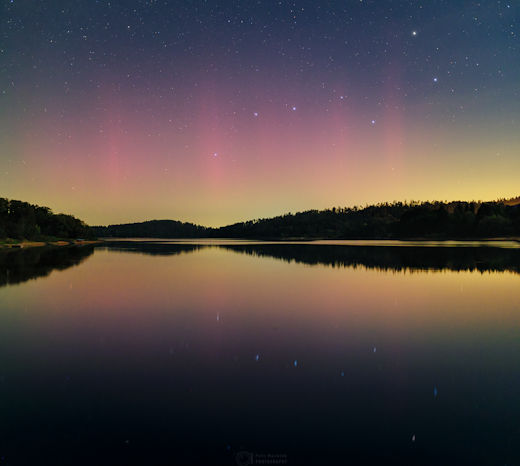 "This morning, on August 28, 2024, around 1 AM (UTC) faint auroras appeared over the Czech Republic," reports Petr Horálek, who sends this picture from the shore of Seč Lake: