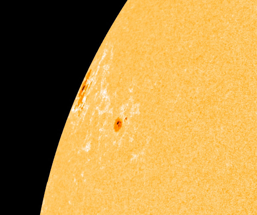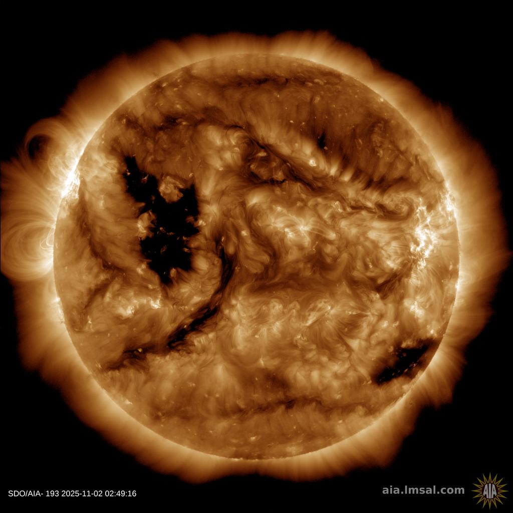 | | | SPACE WEATHER NOAA Forecasts | | Updated at: 2025 Nov 02 2200 UTC FLARE | 0-24 hr | 24-48 hr | CLASS M | 25 % | 40 % | CLASS X | 05 % | 05 % | Geomagnetic Storms: Probabilities for significant disturbances in Earth's magnetic field are given for three activity levels: active, minor storm, severe storm Updated at: 2025 Nov 02 2200 UTC Mid-latitudes | 0-24 hr | 24-48 hr | ACTIVE | 35 % | 20 % | MINOR | 15 % | 05 % | SEVERE | 01 % | 01 % | High latitudes | 0-24 hr | 24-48 hr | ACTIVE | 10 % | 15 % | MINOR | 30 % | 25 % | SEVERE | 50 % | 30 % | | | |  | | | | | | | | | | | This is an AI Free Zone: Text created by Large Language Models is spreading across the Internet. It's well-written, but frequently inaccurate. If you find a mistake on Spaceweather.com, rest assured it was made by a real human being. | | | A SUNSPOT EMERGES: As predicted, a relatively large and potentially active sunspot is emerging over the sun's northeastern limb. It is coming from the sun's farside where it unleashed at least three ( #1, #2, #3) significant CMEs during late October. Will this activity continue? Stay tuned. CME impact alerts: SMS Text. A RARE GOLDEN COMET: Most comets are green, and sometimes blue. In June Lake, California, amateur astronomer Dan Bartlett is tracking a rare golden comet. Introducing, Comet ATLAS (C/2025 K1):  "This comet was not supposed to survive its Oct 8th perihelion (0.33 AU)," says Bartlett. "But it did survive, and now it is displaying a red/brown/golden color rarely seen in comets." What's going on? The chemistry of this Oort Cloud comet is strange. It lacks the carbon compounds normally found in comets, according to spectroscopy by David Schleicher of the Lowell Observatory. "All of the carbon-bearing species, including CN, are unusually low," he wrote in Astronomer's Telegram #17362. In sunlight, cometary gases turn green because of diatomic carbon (C2), and blue because of ionized carbon monoxide (CO+). Subtracting these colors apparently leaves gold. We don't know exactly why--or if it may have something to do with its recent close encounter with the sun. "The comet is fairly impressive at 9th magnitude," says Bartlett. That makes it a relatively easy target for backyard telescopes. Point your optics to the boundary between Virgo and Leo in the eastern sky shortly before sunrise. Sky maps: Nov. 2, 3, 4, 5, 6, 7. more images: from Chris Schur of Payson, Arizona; from Richard Sears of Ballico, California Realtime Space Weather Photo Gallery Free: Spaceweather.com Newsletter WORLD CHAMPION DODGERS SPACE BASEBALL: Move over, Shohei Ohtani. The students of Earth to Sky Calculus just set a new home run record. This Dodger ball launched by the students sailed 123 kilometers and touched the edge of space:  You can have it for $99.95. It's a great gift for anyone celebrating the Dodger's narrow 2025 World Series victory over the Toronto Blue Jays. The baseball traveled to the stratosphere onboard a cosmic ray balloon, alongside X-ray and gamma-ray sensors that the students use to study atmospheric radiation. After the data were collected, the payload parachuted back to Earth, landing in the desert near Gemfield, Nevada, more than 123 km from the California launch site. At the apex of the flight, the baseball was 35.4 km above the ground, experiencing temperatures as low as -62 C and air pressures only 0.2% of sea level. Now that's a homer. Far Out Gifts: Earth to Sky Store All sales support hands-on STEM education Realtime Aurora Photo Gallery Free: Spaceweather.com Newsletter Every night, a network of NASA all-sky cameras scans the skies above the United States for meteoritic fireballs. Automated software maintained by NASA's Meteoroid Environment Office calculates their orbits, velocity, penetration depth in Earth's atmosphere and many other characteristics. Daily results are presented here on Spaceweather.com. On Oct 31, 2025, the network reported 18 fireballs. (13 sporadics, 3 Northern Taurids, 1 Orionid, 1 omicron Eridanid) In this diagram of the inner solar system, all of the fireball orbits intersect at a single point--Earth. The orbits are color-coded by velocity, from slow (red) to fast (blue). [Larger image] [movies] Potentially Hazardous Asteroids ( PHAs) are space rocks larger than approximately 100m that can come closer to Earth than 0.05 AU. None of the known PHAs is on a collision course with our planet, although astronomers are finding new ones all the time. On November 2, 2025 there were 2349 potentially hazardous asteroids.  | Recent & Upcoming Earth-asteroid encounters: | Asteroid | Date(UT) | Miss Distance | Velocity (km/s) | Diameter (m) | | 2025 UM8 | 2025-Oct-28 | 7.3 LD | 14.8 | 36 | | 2025 UH11 | 2025-Oct-28 | 3.3 LD | 14 | 13 | | 2025 UD9 | 2025-Oct-28 | 0.6 LD | 10.4 | 13 | | 2025 UC8 | 2025-Oct-28 | 1.3 LD | 8.1 | 10 | | 2025 UD7 | 2025-Oct-28 | 5.8 LD | 8.6 | 12 | | 2025 UQ11 | 2025-Oct-28 | 2 LD | 10.4 | 14 | | 2025 UQ1 | 2025-Oct-28 | 10.4 LD | 5.8 | 10 | | 2025 UR11 | 2025-Oct-29 | 1.3 LD | 7 | 5 | | 2025 UV7 | 2025-Oct-29 | 0.3 LD | 9.6 | 4 | | 2025 UR14 | 2025-Oct-29 | 1.9 LD | 16.3 | 16 | | 2025 UG11 | 2025-Oct-29 | 2.4 LD | 6 | 7 | | 2025 UD5 | 2025-Oct-29 | 2.5 LD | 3.2 | 20 | | 2025 UH2 | 2025-Oct-29 | 19.3 LD | 8.9 | 29 | | 2025 UV5 | 2025-Oct-29 | 4.3 LD | 5.6 | 18 | | 2025 VA | 2025-Oct-29 | 1.2 LD | 7.6 | 27 | | 2025 UF9 | 2025-Oct-29 | 0.8 LD | 19.7 | 36 | | 2025 UB12 | 2025-Oct-29 | 0.6 LD | 17.7 | 4 | | 2025 UF5 | 2025-Oct-29 | 2 LD | 3 | 10 | | 2025 UX7 | 2025-Oct-29 | 0.9 LD | 20 | 7 | | 2025 UG12 | 2025-Oct-29 | 2.7 LD | 6.8 | 11 | | 2025 UP7 | 2025-Oct-29 | 4 LD | 13.8 | 13 | | 2025 UL2 | 2025-Oct-29 | 3.9 LD | 12.4 | 22 | | 2025 UF12 | 2025-Oct-30 | 2.4 LD | 8.9 | 14 | | 2025 UC11 | 2025-Oct-30 | 0 LD | 11.4 | 1 | | 2025 UF4 | 2025-Oct-30 | 15.3 LD | 10.2 | 78 | | 2025 UE9 | 2025-Oct-30 | 3.4 LD | 24.5 | 18 | | 2025 UK9 | 2025-Oct-30 | 1.1 LD | 7.8 | 4 | | 2025 UH7 | 2025-Oct-31 | 2.2 LD | 7.8 | 8 | | 2025 UN9 | 2025-Oct-31 | 7.2