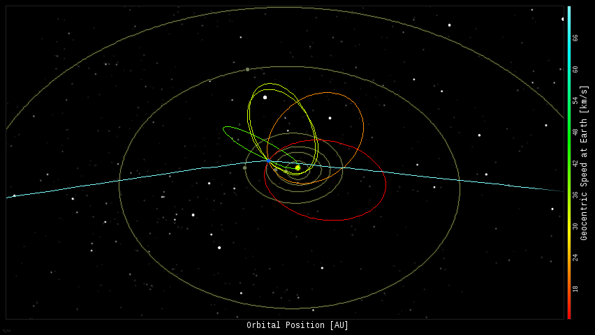 In this diagram of the inner solar system, all of the fireball orbits intersect at a single point--Earth. The orbits are color-coded by velocity, from slow (red) to fast (blue). [Larger image] [movies]