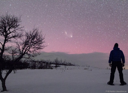 HEAVENLY CONJUNCTION: Last night, Comet Pan-STARRS made a photogenic close approach to the Andromeda galaxy (aka "M31"). Although it was best viewed through the lens of a camera, amateur astronomer P-M Hedén was able to see the heavenly conjunction with his unaided eyes: