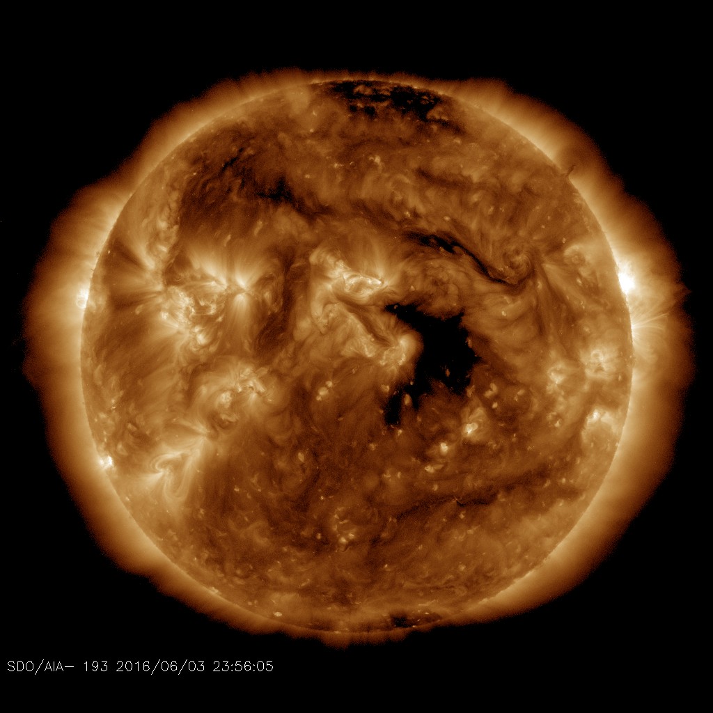 WEEKEND STORMS ARE LIKELY: NOAA forecasters estimate a 70% chance of geomagnetic storms on June 4th and 5th when a solar wind stream hits Earth's magnetic field. Deja vu? This stream has been here before. On May 8th (Mother's Day), it sparked the strongest geomagnetic storm of 2016. During that G3-class event, auroras were photographed in the USA as far south as Kansas and Arkansas. This time, analysts expect the storm to peak at G2--not as strong as the Mother's Day Storm, but still worth watching. High-latitude sky watchers should be alert for auroras,especially in the southern hemisphere where darkening autumn skies favor visibility. Aurora alerts: text, voice.