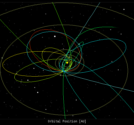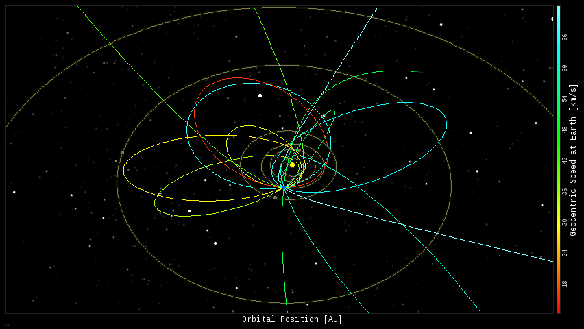 In this diagram of the inner solar system, all of the fireball orbits intersect at a single point--Earth. The orbits are color-coded by velocity, from slow (red) to fast (blue). [Larger image] [movies]