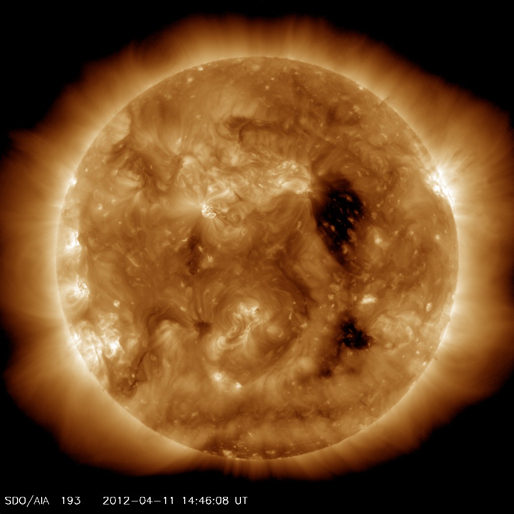 More Arctic lights are possible on April 13-14 when a high speed solar wind stream is expected to hit Earth's magnetic field. NOAA forecasters estimate a 20% chance of geomagnetic storms around the poles. Aurora alerts: text, phone.