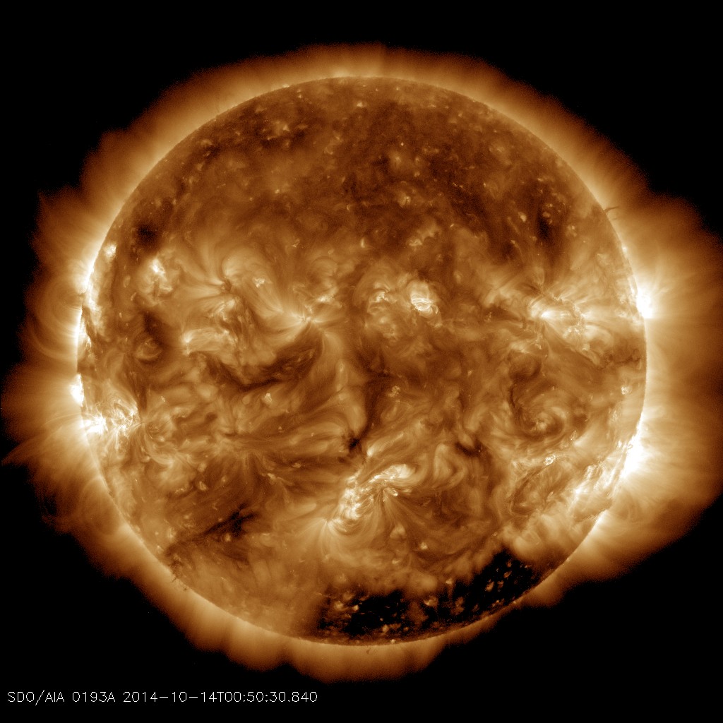SOLAR SECTOR BOUNDARY CROSSING: High-latitude auroras are possible on Oct. 14th when Earth crosses through a fold in the heliospheric current sheet. This is called a "solar sector boundary crossing," and NOAA forecasters estimate a 25% chance of polar geomagnetic storms when it occurs. Aurora alerts: text, voice