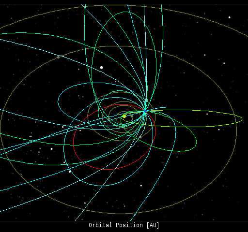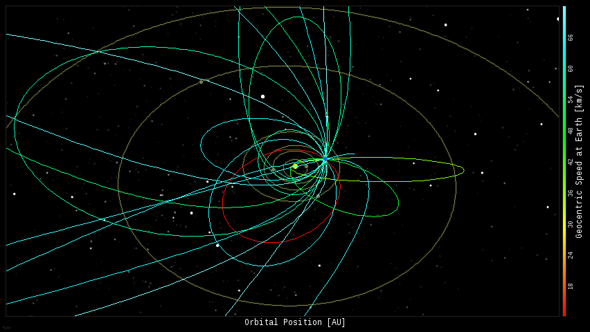 In this diagram of the inner solar system, all of the fireball orbits intersect at a single point--Earth. The orbits are color-coded by velocity, from slow (red) to fast (blue). [Larger image] [movies]
