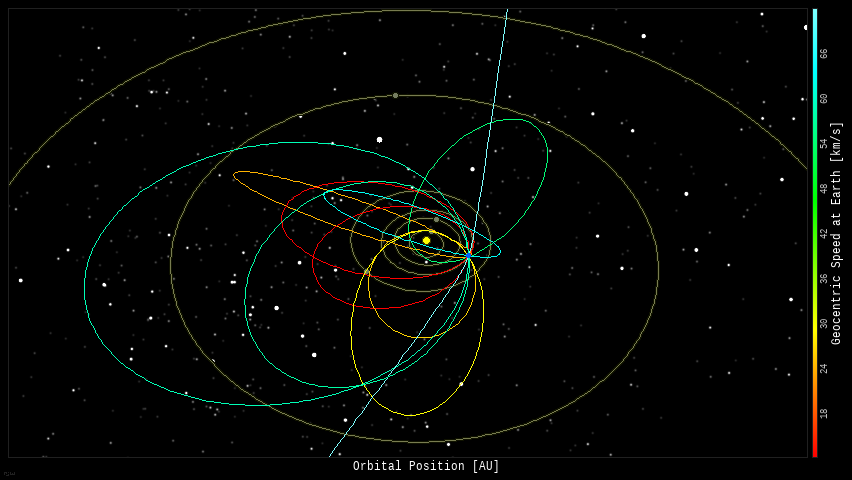 See the complete NLC Photo Gallery SPACE WEATHER NOAA Forecasts | | Updated at: 2025 Aug 26 2200 UTC FLARE | 0-24 hr | 24-48 hr | CLASS M | 60 % | 60 % | CLASS X | 10 % | 10 % | Geomagnetic Storms: Probabilities for significant disturbances in Earth's magnetic field are given for three activity levels: active, minor storm, severe storm Updated at: 2025 Aug 26 2200 UTC Mid-latitudes | 0-24 hr | 24-48 hr | ACTIVE | 25 % | 20 % | MINOR | 10 % | 05 % | SEVERE | 01 % | 01 % | High latitudes | 0-24 hr | 24-48 hr | ACTIVE | 15 % | 15 % | MINOR | 30 % | 30 % | SEVERE | 40 % | 25 % | | | |  | | | | | | | | | | | This is an AI Free Zone: Text created by Large Language Models is spreading across the Internet. It's well-written, but frequently inaccurate. If you find a mistake on Spaceweather.com, rest assured it was made by a real human being. | | | INCREASING CHANCE OF FLARES: A phalanx of large sunspots is turning toward Earth: movie. Among them, sunspot 4199 is crackling with M-class flares, while big sunspot 4197 has a delta-class magnetic field that harbors energy for even stronger X-flares. Earth is entering the strike zone of these active regions, and we will soon be in the bulls eye. Geoeffective solar flares are in the offing. Solar flare alerts: SMS Text  Above: Growing sunspot 4197 dwarfs Earth. Photo credit: Philippe Tosi of Nîmes, France Realtime Space Weather Photo Gallery Free: Spaceweather.com Newsletter PLANETARY WAVE SPARKS LATE-SEASON NLCs: Usually the summer season for noctilucent clouds (NLCs) is over by now. Instead, Arctic sky watchers have been seeing some very bright NLCs:  "I caught these late-season NLCs drifting in front of the crescent Moon on Aug. 21st," reports Sebastian Sainio of Björköby, Finland. Almost a thousand kilometers away in Kiruna, Sweden, the clouds were so bright, they "seemed like sunrise," while polar air travelers witnessed dramatic displays from the window seat. What's going on? Lynn Harvey of the Laboratory for Atmospheric and Space Physics (CU Boulder) found the answer. "There is a beautiful 5-day planetary wave that is driving temperatures over Scandinavia to be ~10 K colder than in other longitude sectors in the last few days," she explains. This Hovmöller diagram from NASA's microwave limb sounder (MLS) shows the cold wave:  Normally, late August warmth melts away icy NLCs in the mesosphere. The planetary wave, however, has reversed that trend. Cold troughs in the wave freeze water vapor around meteoric dust, seeding these unseasonal night-shining clouds. The NLCs could reappear at 5-day intervals. That’s because planetary waves--giant atmospheric ripples with natural periods of 2, 5, 10, and 16 days--are the drivers. The 5-day mode is the strongest, a fundamental global oscillation of Earth's atmosphere. If you live around the Arctic Circle, please be alert for these late-season clouds, and submit your photos here Realtime Noctilucent Cloud Photo Gallery Free: Spaceweather.com Newsletter LITTLE GREEN SANTA ORNAMENT: You can't buy this on Amazon: The Little Green Santa Christmas Ornamant is only available from the Earth to Sky Store. On Aug. 22, 2025, it flew to the stratosphere onboard a cosmic ray research balloon:  You can have it for $99.95. Hand-sculpted in the USA, this humorous ornament shows Santa arriving from the North Pole of a distant planet. Durable polyresin construction makes it lightweight enough to hang on any tree, but sturdy enough to last for many Christmases to come. The students are selling space ornaments to pay the helium bill for their cosmic ray ballooning program. Each one comes with a greeting card showing the ornament in flight and telling the story of its trip to the stratosphere and back again. Far Out Gifts: Earth to Sky Store All sales support hands-on STEM education Realtime Space Weather Photo Gallery Free: Spaceweather.com Newsletter Realtime Aurora Photo Gallery Free: Spaceweather.com Newsletter Every night, a network of NASA all-sky cameras scans the skies above the United States for meteoritic fireballs. Automated software maintained by NASA's Meteoroid Environment Office calculates their orbits, velocity, penetration depth in Earth's atmosphere and many other characteristics. Daily results are presented here on Spaceweather.com. On Aug 26, 2025, the network reported 10 fireballs. (9 sporadics, 1 kappa Cygnid) In this diagram of the inner solar system, all of the fireball orbits intersect at a single point--Earth. The orbits are color-coded by velocity, from slow (red) to fast (blue). [Larger image] [movies] Potentially Hazardous Asteroids ( PHAs) are space rocks larger than approximately 100m that can come closer to Earth than 0.05 AU. None of the known PHAs is on a collision course with our planet, although astronomers are finding new ones all the time. On August 26, 2025 there were 2349 potentially hazardous asteroids.  | Recent & Upcoming Earth-asteroid encounters: | Asteroid | Date(UT) | Miss Distance | Velocity (km/s) | Diameter (m) | | 2025 OB3 | 2025-Aug-21 | 8.8 LD | 7 | 50 | | 2025 QM3 | 2025-Aug-21 | 0.5 LD | 9.2 | 6 | | 2025 QU4 | 2025-Aug-21 | 11 LD | 18.4 | 25 | | 2025 QU5 | 2025-Aug-21 | 1.1 LD | 9 | 7 | | 2025 PN2 | 2025-Aug-21 | 9.9 LD | 16.6 | 31 | | 2022 QD3 | 2025-Aug-21 | 15.4 LD | 6.9 | 35 | | 2025 QB4 | 2025-Aug-22 | 2 LD | 13.7 | 8 | | 2025 QV4 | 2025-Aug-22 | 4.2 LD | 16.7 | 32 | | 2025 QY | 2025-Aug-22 | 7.5 LD | 7.8 | 15 | | 2023 PX | 2025-Aug-22 | 2.4 LD | 8.3 | 23 | | 2025 QE4 | 2025-Aug-22 | 1.3 LD | 6.4 | 10 | | 2025 QE2 | 2025-Aug-22 | 17.1 LD | 7.2 | 35 | | 2025 QA5 | 2025-Aug-23 | 2.6 LD | 8 | 10 | | 2025 PR | 2025-Aug-23 | 17.6 LD | 3.4 | 22 | | 2025 QF4 | 2025-Aug-23 | 4.2 LD | 10.7 | 12 | | 2019 QQ6 | 2025-Aug-24 | 9.4 LD | 17.2 | 31 | | 2025 QV3 | 2025-Aug-25 | 9.9 LD | 6.2 | 11 | | 2025 QB3 | 2025-Aug-26 | 19.1 LD | 7 | 21 | | 2025 QK3 | 2025-Aug-26 | 11.7 LD | 12.7 | 37 | | 2025 QB5 | 2025-Aug-26 | 11.7 LD | 4.8 | 26 | | 2025 QC1 | 2025-Aug-27 | 4.2 LD | 9.4 | 2