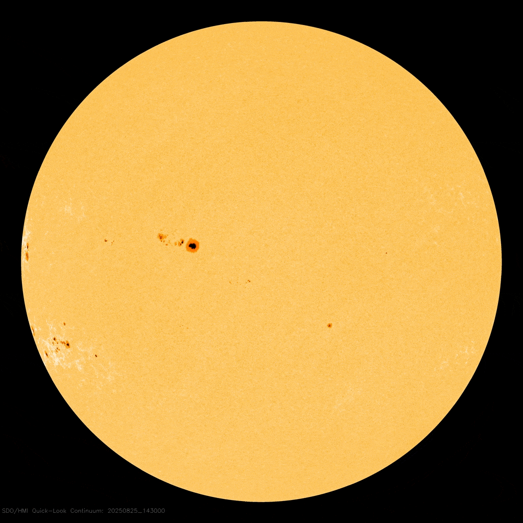 | | | Switch to: Europe, USA, New Zealand, Antarctica Credit: NOAA/Ovation Planetary K-index Now: Kp= 1.33 quiet 24-hr max: Kp= 3.00 quiet explanation | more data Interplanetary Mag. Field Btotal: 5.11 nT Bz: 0.08 nT north more data: ACE, DSCOVR Updated: Today at 1146 UT Coronal Holes: 26 Aug 25  Solar wind flowing from this coronal hole should reach Earth on Aug. 26. Credit: NASA/SDO | more data Polar Stratospheric Clouds Colorful Type II polar stratospheric clouds (PSC) form when the temperature in the stratosphere drops to a staggeringly low -85C. NASA's MERRA-2 climate model predicts when the air up there is cold enough:  On Aug 25, 2025, the Arctic stratosphere is much too hot for polar stratospheric clouds. | more data. Noctilucent Clouds The northern season for noctilucent clouds is underway. First reports of the electric-blue clouds came from Russia on May 28, 2025. Since then, the clouds have spread to lower latitudes, reaching Paris, France, during a major outbreak on June 23, 2025. The seson is ending in an interesting way. Usually the clouds vanish in August, but they have persisted and sometimes been quite storng as August comes to an end.