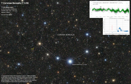 Observing tips: (1) Tonight, go outside and see what Corona Borealis normally looks like: sky map. Then, when the nova explodes, you'll be able to tell the difference. (2) Sign up for Space Weather Alerts. All subscribers (Basic and Pro) will receive an immediate text message when the nova explodes.