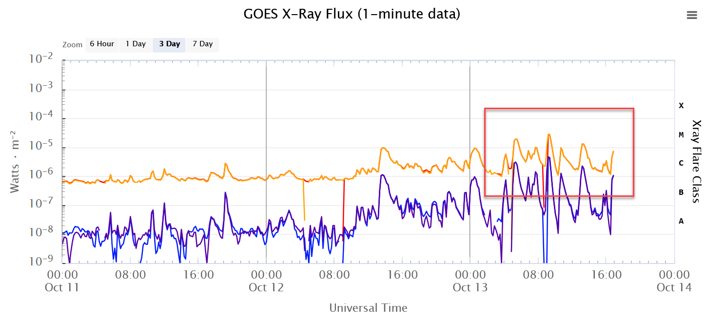 POSSIBLE EARTH-DIRECTED CMEs: A series of M-class solar flares from sunspot AR4246 on Oct. 13th may have hurled one or more CMEs toward Earth. None of them appears to be a major storm cloud, but their combined effect could spark a geomagnetic storm later this week. Forecast modeling is underway. CME impact alerts: SMS Text.